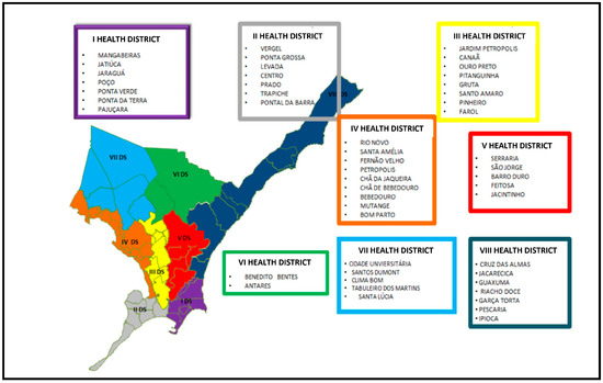 This study was conducted in Maceió—the capital of Alagoas, northeastern Brazil. Its typical climate is hot and humid with a low thermal amplitude and high pluviosity in the fall and winter, notably between April and August [12]. Maceió houses approximately 29.94% of the population of Alagoas and extends for 509,552 km/m2. Following the geographical organization designed by the Brazilian Unified Health System, the 51 neighborhoods of Maceió are subdivided into 8 health districts (Figure 1). The Seventh Health District covers five neighborhoods—“Cidade Universitária”, “Clima Bom”, “Santos Dumont”, “Tabuleiro dos Martins”, and “Santa Lúcia” [13].