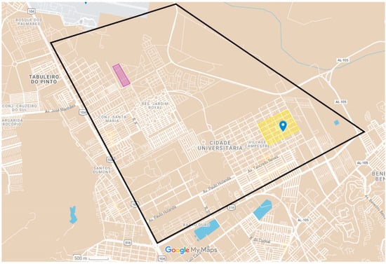 Distribution of the outbreaks of sporotrichosis in Maceió-AL. Within the black lines is the Cidade Universitária neighborhood. The yellow square shows the location of the first outbreak, and the purple rectangle delimits the area of the second outbreak.