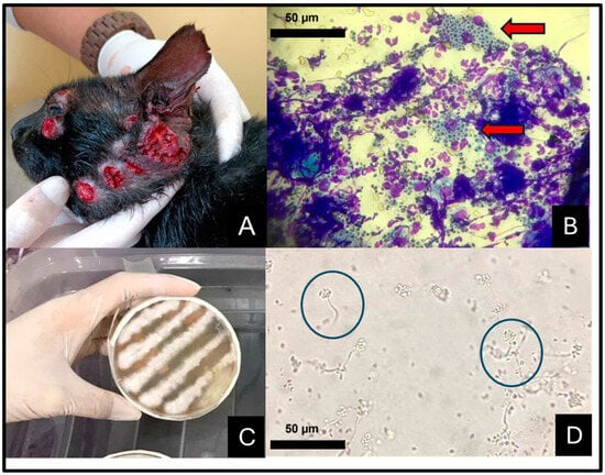 Feline sporotrichosis in the Seventh Health District of Maceió-AL, northeastern Brazil. (A) Cat presenting multiple ulcerative, exudative, and hemorrhagic lesions on the face. (B) Cytologic sample exhibiting intense pyogranulomatous inflammation and intra-histocyte yeast structures (red arrows). Fast panoptic stain, 40×. (C) Yeast formed seven days following inoculation on Sabouraud dextrose agar at 37 °C. Obj. 40×. (D) Tape prep of fungal growth in Sabouraud agar stained with lactophenol cotton blue showing colonies of undifferentiated hyphae in a daisy-petal pattern (blue circles). Obj. 40×.