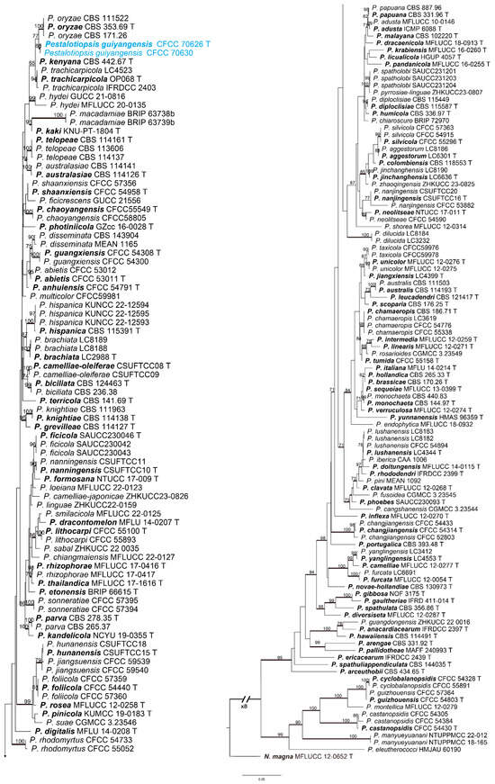 Species of pestalotioid fungi have various ecological behaviors as plant pathogens, endophytes, or saprobes, and are widespread in temperate and tropical regions [,,]. Pestalotiopsis was divided from Pestalotia as a distinct genus, on the basis of varying numbers of conidia, by Steyaert in 1949 []. Subsequently, Nag Raj [,] argued that the categorization of many species in Pestalotiopsis, as delineated by Steyaert, is problematic and pointed out that the type of species associated with Pestalotiopsis must be re-examined. In 2014, Maharachchikumbura et al. [] reclassified Pestalotiopsis into three genera (Neopestalotiopsis, Pestalotiopsis, and Pseudopestalotiopsis). Neopestalotiopsis differs from Pestalotiopsis and Pseudopestalotiopsis based on its multicolored median cells []. Pseudopestalotiopsis can be distinguished from Pestalotiopsis by comparing the color of the concolorous median cells for those possessing equally pigmented median cells []. Currently, the three genera are grouped as Pestalotioid fungi [].