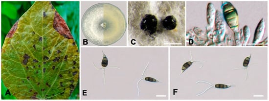 Neopestalotiopsis cercidicola (ex-holotype culture CFCC 70632). (A) Diseased leaf of Cercis chinensis; (B) Colony on PDA at seven days; (C) Conidial masses formed on PDA; (D) Conidiogenous cells; (E,F) Conidia. Scale bars: (C–F) = 10 μm.