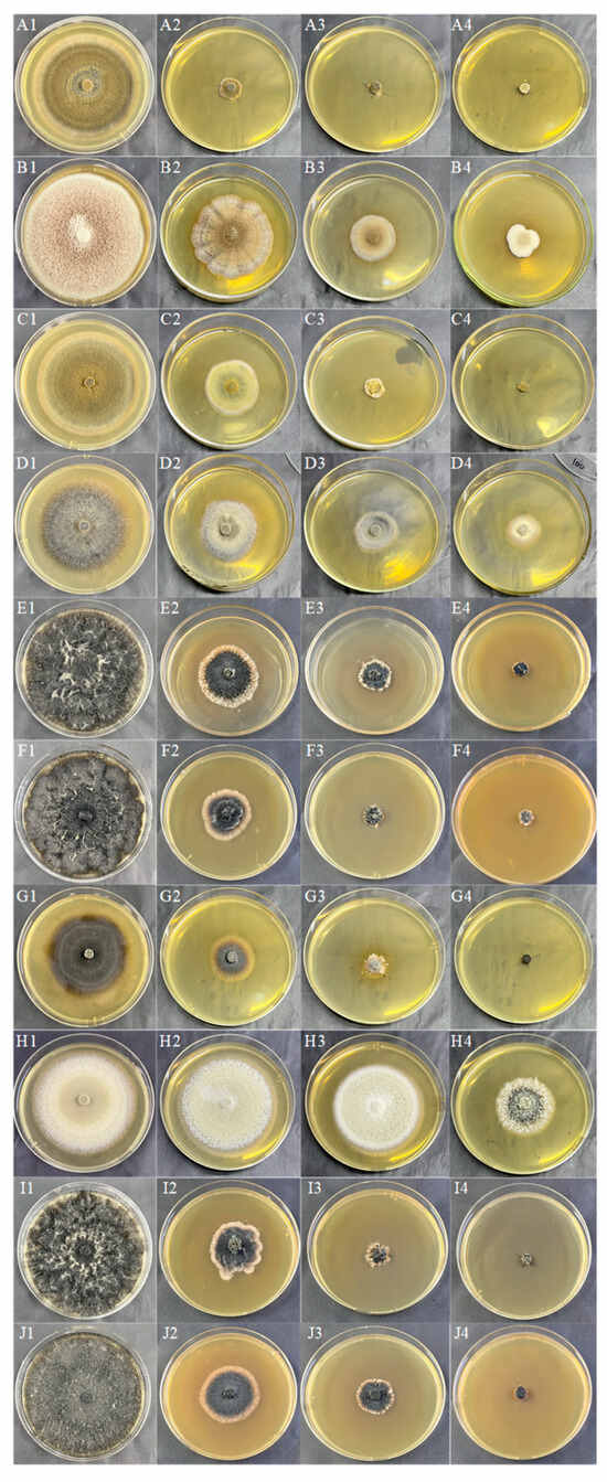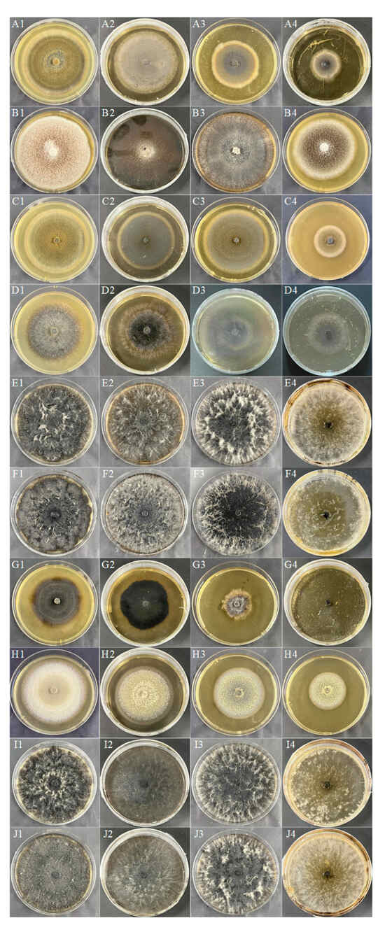 DSE colony morphology under different Cd stresses. (A–J) stands for M. cytisi (Mc), A. alstroemeriae (Aa), S. lupini (Sl), N. phragmitis (Np), P. chlamydocopiosa (Pc), M. phaseolina (Mp’), P. equi (Pe), A. tellustris (At), M. pseudophaseolina (Mp), and P. radicina (Pr). 1–4 indicates Cd stress gradients of 0, 25, 50, and 100 mg/L, respectively.