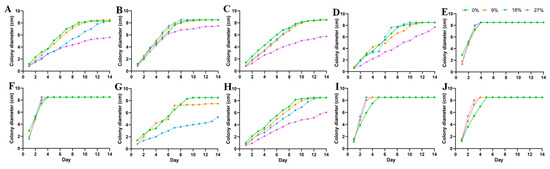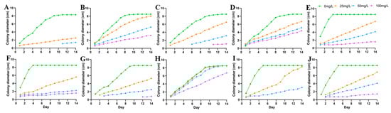 Growth diameters of 10 DSE strains under different Cd stresses. (A–J) stands for M. cytisi (Mc), A. alstroemeriae (Aa), S. lupini (Sl), N. phragmitis (Np), P. chlamydocopiosa (Pc), M. phaseolina (Mp’), P. equi (Pe), A. tellustris (At), M. pseudophaseolina (Mp), and P. radicina (Pr).
