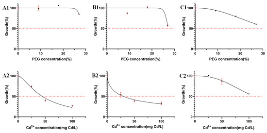 Effect of PEG concentration (A1–C1) and Cd concentration (A2–C2) on the mean and standard deviation (solid bars, n = 3) of the tolerance index (TI) of selected stress-tolerant strains measured in radial growth in PDA medium after 8 d of incubation. The solid line corresponds to the fitted logistic model used to determine the IC50 values. (A–C) stands for A. alstroemeriae (Aa), N. phragmitis (Np), and A. tellustris (At).