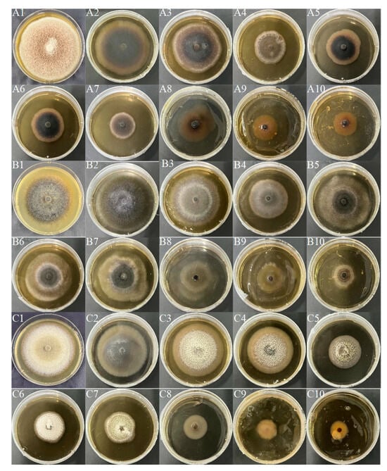 DSE colony morphology under different combined stress of drought and Cd. (A–C) stands for A. alstroemeriae (Aa), N. phragmitis (Np), and A. tellustris (At). 1–10 indicate that the combined stress gradients of drought and Cd are 0, 9% + 25 mg Cd/L, 9% + 50 mg Cd/L, 9% + 100 mg Cd/L, 18% + 25 mg Cd/L, 18% + 50 mg Cd/L, 18% + 100 mg Cd/L, 27% + 25 mg Cd/L, 27% + 50 mg Cd/L, and 27% + 100 mg Cd/L, respectively.