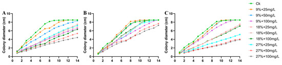 Drought-and-Cd-combined stress was simulated by adding PEG-6000 and Cd ion master batch at a concentration of 10 mg/mL to the PDA medium at different ratios, and the combined stress concentration gradients were set to 0, 9% + 25 mg Cd/L, 9% + 50 mg Cd/L, 9% + 100 mg Cd/L, 18% + 25 mg Cd/L, 18% + 50 mg Cd/L, 18% + 100 mg Cd/L, 27% + 25 mg Cd/L, 27% + 50 mg Cd/L, and 27% + 100 mg Cd/L [30]. Colonies of DSE, after 14 d of cultivation, were sampled for a fungal inoculum of 5 mm in diameter from their periphery. These were placed at the center of the PDA medium, which was prepared with varying gradients of drought-and-Cd-combined stress concentrations. The inoculated medium was then incubated at 27 °C for a period of 14 d in a dark, inverted incubator. A control group (CK), representing conventional culture conditions without any additional treatment, was included alongside ten experimental treatments, each with three replicates.