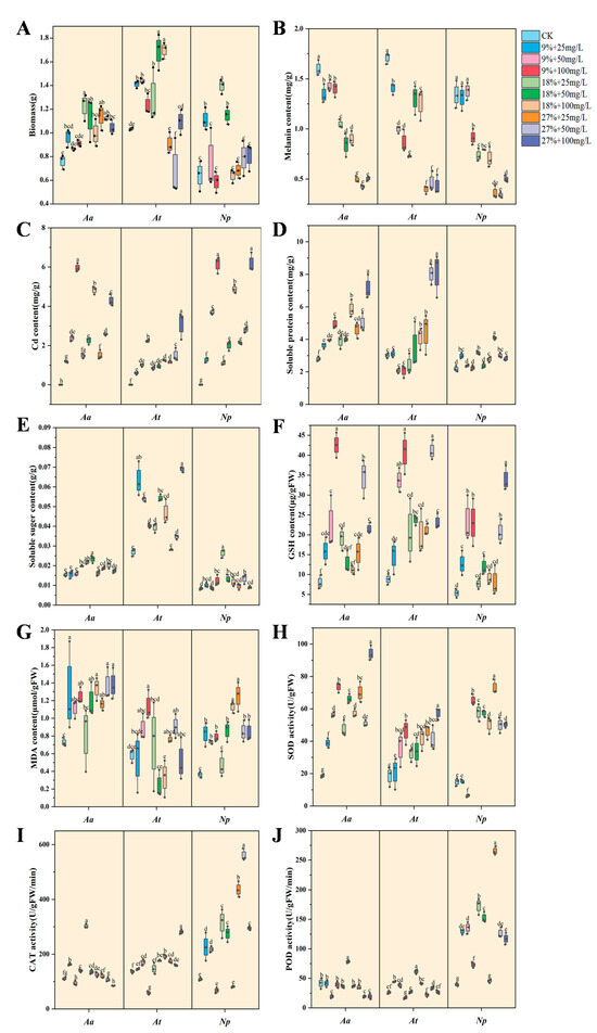 The soluble protein content of Aa and Np strains increased with the increase of combined stress (Figure 8D). Compared with the control, the soluble protein content of Aa under all combined stress treatments increased and reached the maximum value in 27% + 100 mg Cd/L treatment, which was 2.55 times that of the control and increased by 155.36% compared with the control. At the combined concentration of 18% + 100 mg Cd/L, 27% + 25 mg Cd/L, 27% + 50 mg Cd/L, and 27% + 100 mg Cd/L, the soluble protein content of At was increased compared to the control and reached the maximum value at the combined concentration of 27% + 100 mg Cd/L, which was increased by 181.94% in comparison to the control. No significant differences were observed between the other treatments and the control group. However, the soluble protein content in the Np peaked under the 27% + 25 mg/L Cd treatment, exhibiting a substantial increase of 87.16% relative to the control.