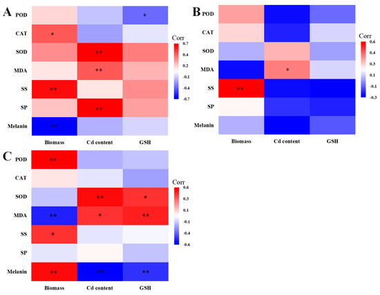 The relationship between biomass, Cd content, GSH and melanin, SP, SS, MDA, SOD, CAT, and POD was further analyzed for each DSE (Figure 9), and the correlations between the individual metrics varied depending on the DSE.