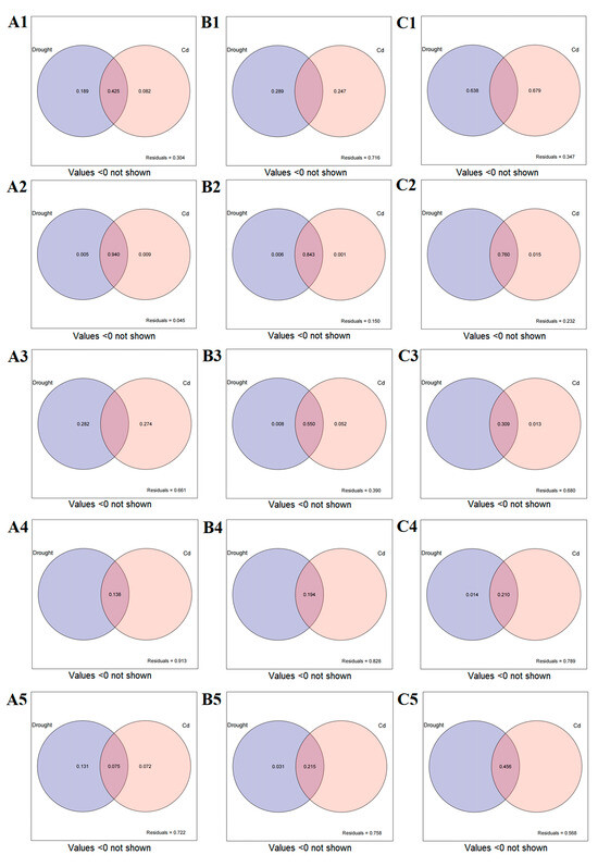 In terms of Cd content, the combined stress factors explained 27.8% of the variance in the Aa strain, with individual contributions of 13.1% for drought and 7.2% for Cd stress, and the interaction between the two factors was 7.5% (Figure 10(A5)). For the Np strain, the combined stress factors explained 24.2% of the variance in Cd content, with drought stress contributing 3.1% and the interaction between drought and Cd stress accounting for 21.5% (Figure 10(B5)). For the At strain, the combined explanation of drought and Cd stress on Cd content was 43.2%, with the interaction between the two stressors contributing a significant 45.6% (Figure 10(C5)).