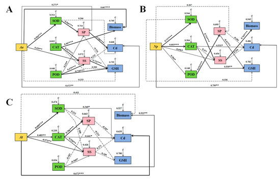 Structural-equation modeling of causal relationships between DSE and enzyme activity, soluble matter, biomass, Cd, and GSH content. (A–C) represents structural-equation models of A. alstroemeriae (Aa), N. phragmitis (Np), and A. tellustris (At), respectively. SS represents soluble sugar, and SP represents soluble protein. Results of fitness of influencing factors of Aa: (A) χ2 = 8.500, df = 6, p = 0.004, RMSEA (root mean square error of approximation) = 0.120, GFI (goodness-of-fit index) = 0.942, IFI (incremental fit index) = 0.987, CFI (comparative fit index) = 0.984; Results of fitness of influencing factors of Np: (B) χ2 = 28.978, df = 6, p = 0.001, RMSEA = 0.363, GFI = 0.870, IFI = 0.883, CFI = 0.862; Results of fitness of influencing factors of At: (C) χ2 = 21.358, df = 6, p = 0.002, RMSEA = 0.297, GFI = 0.877, IFI = 0.913, CFI = 0.895. Whether the path of action between various factors was significant or not is indicated by the solid and dotted lines, respectively. The numbers near the arrows represent the normalized path coefficients, and the width of the solid line represents the strength of the effect between the various factors (* p < 0.05, ** p < 0.01, and *** p < 0.001).