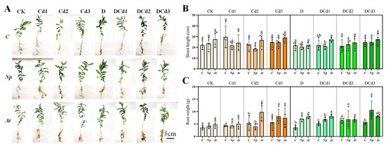 DSE is widespread in natural ecosystems and can help plants to resist a variety of stressful environments, especially under harsh conditions (e.g., saline, contaminated habitats, and arid ecosystems) [9]. Inoculation with DSE is beneficial for plant growth and resistance, but different DSE strains vary in their ability to promote host plants [75]. It was shown that under moderate- and high-salt stress conditions, P. macrospinosa and Cadophora sp. improved the shoot and root growth of tomato plants after 6 weeks of inoculation [76]. Under single and synergistic stresses of drought and salt, inoculation with F. mosseae significantly increased the fresh weight of hemp plants. However, inoculation with F. Mosseae had no significant effect on hemp plant height [77]. The study showed that inoculation with N. phragmitis under drought stress significantly increased the plant height of Lycium ruthenicum [78]. Compared with non-inoculated treatments, there was no significant difference in inoculation with N. phragmitis on the shoot height of A. membranaceus in all treatments of this experiment. It may be that the same DSE shows different effects on different plants. However, inoculation with N. phragmitis under D, DCd1, and DCd3 treatments significantly increased the root weight of A. membranaceus. Compared with non-inoculated treatments, root weight was significantly increased inoculation of A. tellustris under Cd2, D, and DCd1 treatments. The effect of inoculation with DSE on the growth of A. membranaceus under drought and Cd stress varied depending on the type of DSE but was generally beneficial.