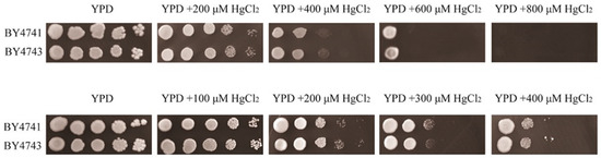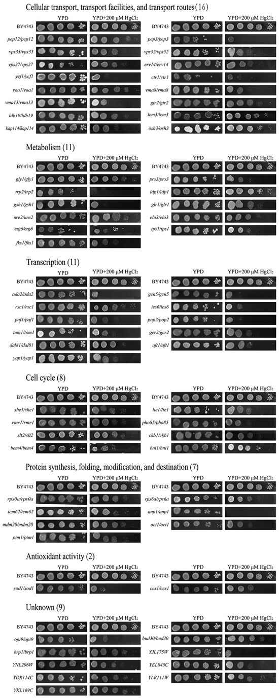 To clearly observe the differences in plaque growth phenotypes and the sensitivity of different individual mutant strains, the serial dilution method was used to verify the preliminary screening results. The mutant strains were inoculated from the mutant strain library into a liquid YPD medium for overnight growth. Then, it was diluted and spotted onto YPD plates with or without HgCl2. Based on the growth of their phenotype, their specific sensitivity to mercury was retested by comparing it with the wild-type strain BY4743 [13,14], and the secondary screen was repeated three times.