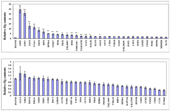 Cellular Hg contents of 64 Hg-sensitive gene deletion mutants in response to Hg stress. The intracellular mercury content of the mutant strains sensitive to mercury was measured using an atomic fluorescence spectrometer (AFS-PF32). The result was expressed as the mean ± SEM. The difference in treatment groups was analyzed using SPSS 16.0 software. The one-way analysis of variance (ANOVA) was performed to assess the least significant difference (LSD), and p < 0.05 is set as the significance level. ** p < 0.01, * p < 0.05.