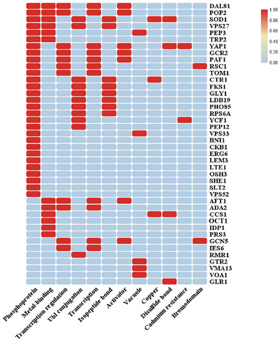 In the enrichment analysis of GO molecular functions, the enriched terms are antioxidant activity (SOD1, CCS1, URE2, and GLR1), transcription coregulator activity (ADA2, GCN5, DAL81, URE2, and GCR2), phospholipid binding (PEP3, VPS33, ADA2, VPS27, and OSH3), Ras GTPase binding (LTE1, VPS52, KAP114, and BNI1), ATPase activity and coupled to transmembrane movement of substances (YCF1, VMA13, and VMA8), transferase activity, and transferring hexosyl groups (FKS1, TPS1, and ANP1) (Table 5).