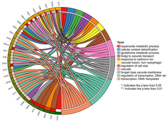 The functional classification shows that 64 mercury-sensitive genes can be divided into the following seven functional groups: cellular transport, transport facilities, and transport routes (16); metabolism (11); transcription (11); cell cycle (8); protein synthesis, folding, modification, and destination (7); antioxidant activity (2); and unclassified (9) (Table 1, Figure 2). Proteins encoded by these genes are mainly localized in the nucleus (12), vacuole (6), cytosol (20), endoplasmic reticulum (ER) (6), Golgi (2), mitochondrion (5), endosome (1), plasmalemma (2), and unknown genes (10) (Table 2). In addition, the functions of 64 mercury-sensitive genes were analyzed based on the Saccharomyces Genome Database (https://yeastgenome.org/, accessed on 1 March 2022), which are listed in Supplementary Table S2.