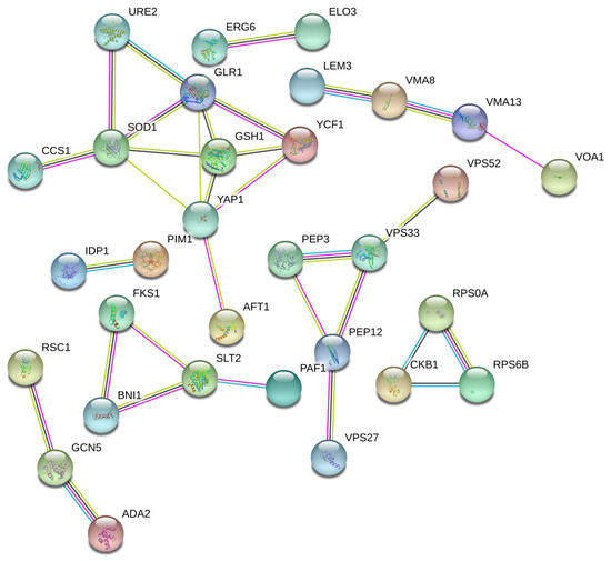 According to the bioinformatics analysis of the KEGG pathway [19], these genes play a significant role in five important pathways in yeast cells. To perform KEGG pathway enrichment analysis, we utilized the DAVID (Database for Annotation, Visualization, and Integrated Discovery) tool. They are glutathione metabolism (IDP1, GSH1, URE2, and GLR1), phagosome (VPS27, VMA13, and VMA8), autophagy (PEP3, VPS33, PHO85, and SLT2), MAPK signaling pathway (FKS1, PAF1, BNI1, and SLT2), and biosynthesis of amino acids (IDP1, PRS3, GLY1, and TRP2) (Table 6).