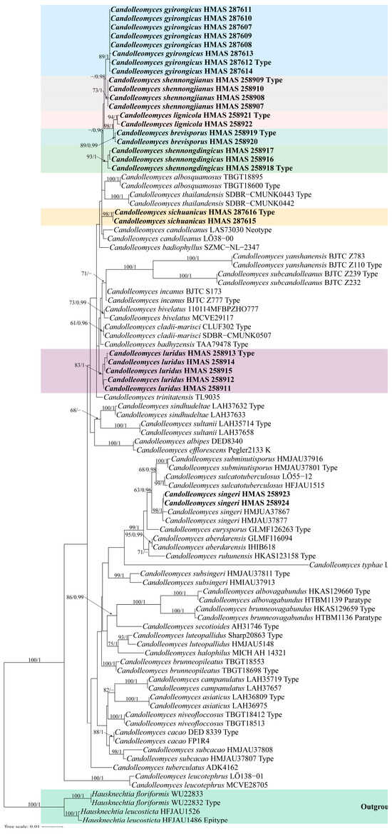 Eighty-nine specimens from 43 Candolleomyces species were included in the phylogenetic analyses with Hausknechtia floriformis (Hauskn.) D. Wächt. & A. Melzer and H. leucosticta (Pat.) Tkalčec, J.Q. Yan, C.F. Nie & C.K. Pradeep as outgroups. In total, 84 new sequences were generated in this study, which were from 28 specimens from China, all with the nrITS, nrLSU, and tef-1α sequences. The combined dataset with 3033 characters including gaps (679 for nrITS, 1322 for nrLSU, and 1032 for tef-1α) was included in the phylogenetic analyses. The phylogenetic tree of ML and MrBayes were almost identical. The ML tree is shown in Figure 1 with bootstrap values and Bayesian posterior probabilities indicated on the branches.