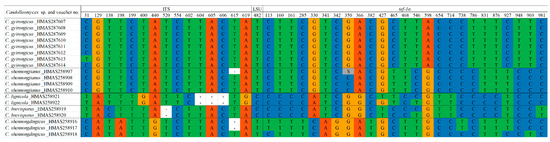 Nucleotide differences of Candolleomyces brevisporus, C. shennongdingicus, C. gyirongicus, C. lignicola, and C. shennongjianus across ITS, LSU, and tef-1α. The numbers at the top indicate the positions of the polymorphic sites in each fragment. The dashes indicate the lack of data for the respective positions.