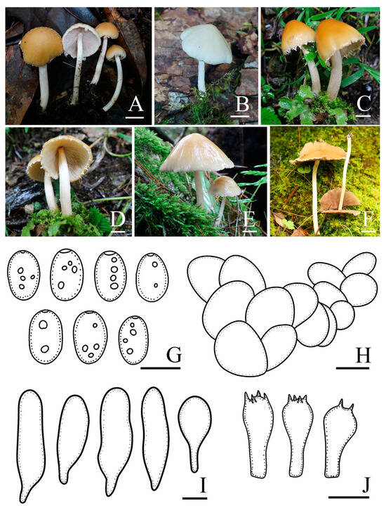 Basidiomata and microscopic features of Candolleomyces gyirongicus. (A–F) Basidiomata: (A) HMAS 287607; (B) HMAS 287610; (C,D) HMAS 287611; (E) HMAS 287612 (holotype); (F) HMAS 287614, (G) Basidiospores, (H) Pileipellis, (I) Cheilocystidia, and (J) Basidia. Scale bars: 10 mm (A–F); 5 μm (G); 20 μm (H); and 10 μm (I,J).