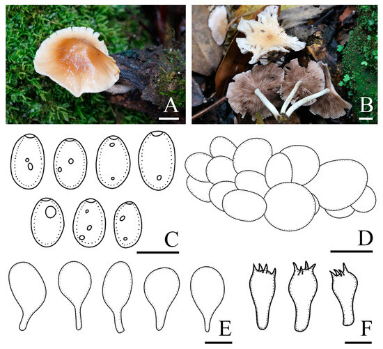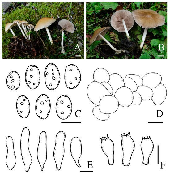 Basidiomata and microscopic features of Candolleomyces shennongdingicus. (A,B) Basidiomata: (A) HMAS 258918 (holotype); (B) HMAS 258916, (C) Basidiospores, (D) Pileipellis, (E) Cheilocystidia, (F) Basidia. Scale bars: 10 mm (A,B); 5 μm (C); 20 μm (D); 10 μm (E,F).