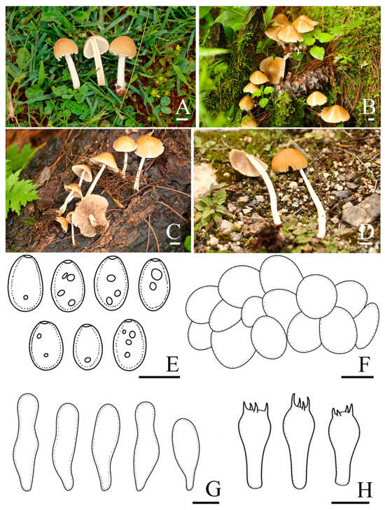 Notes: In the field, Candolleomyces shennongdingicus can be easily confused with C. shennongjianus at first glance, as both species have parabolic pileus when young and convex when mature, and yellowish brown pileus. Additionally, both species exhibit white stipes with pale yellowish brown bases. However, C. shennongdingicus can be distinguished by its slightly smaller basidiospores, longer basidia, as well as fusiform, seldom cylindrical to clavate, and smaller cheilocystidia. Moreover, phylogenetic analysis reveals that C. shennongdingicus is distinct from C. shennongjianus (Figure 3). Based on morphology and phylogenetic analyses, Candolleomyces shennongdingicus is introduced as a new species (Figure 1 and Figure 7).