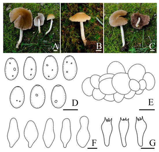 Basidiomata and microscopic features of Candolleomyces shennongjianus. (A–C) Basidiomata: (A) HMAS 258909 (holotype); (B) HMAS 258907; (C) HMAS 258910, (D) Basidiospores, (E) Pileipellis, (F) Cheilocystidia, and (G) Basidia. Scale bars: 10 mm (A–C); 5 μm (D); 20 μm (E); and 10 μm (F,G).
