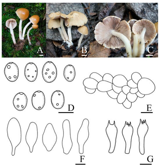 Basidiomata and microscopic features of Candolleomyces brevisporus. (A–C) Basidiomata: (A,B) HMAS 258919 (holotype); (C) HMAS 258920, (D) Basidiospores, (E) Pileipellis, (F) Cheilocystidia, and (G) Basidia. Scale bars: 10 mm (A–C); 5 μm (D); 20 μm (E); and 10 μm (F,G).