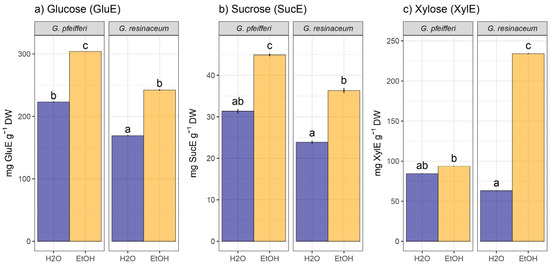 Total carbohydrate content: (a) glucose, (b) sucrose, and (c) xylose. Different small letters indicate significant differences among different analyzed extracts of G. pfeifferi and G. resinaceum; Tukey’s significant difference (HSD) post hoc test (p ≤ 0.05). Data represent the mean ± standard deviation (SD).