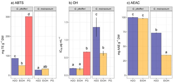 Antioxidant activity in hot-water (H2O) and ethanolic (EtOH) extracts of G. pfeifferi and G. resinaceum: (a) RSC against ABTS radical (2,2′-azinobis-3-ethylbenzothiazoline-6-sulfonic acid); (b) radical scavenger capacity against OH radical; (c) ascorbate equivalent antioxidant capacity (A.E.A.C.) assay. The distinct lowercase letters denote significant differences observed among different analyzed samples, including the standard compound propyl gallate (PG), as determined by Tukey’s honestly significant difference (HSD) post hoc test (p ≤ 0.05). The data are presented as the mean ± standard deviation (SD).