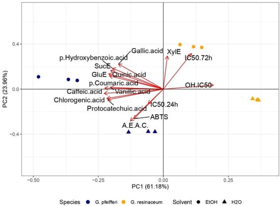 Principal Component Analysis (PCA) of the observed antioxidant and antiproliferative activity along with phenolic compounds (Table S1) [12] and total carbohydrate content (TCC) in the four examined fungal extracts of G. pfeifferi and G. resinaceum. The following are the abbreviations of the examined parameters: EtOH—ethanolic extract; H2O—hot-water extract; ABTS—2,2′-azinobis(3-ethylbenzothiozoline)-6-sulfonic acid; OH—hydroxyl radical; A.E.A.C.—ascorbate equivalent antioxidant capacity; IC50 24 h/72 h—antiproliferative inhibitory concentration in the case of incubation of 24 h and 72 h; GluE—glucose equivalents; SucE—sucrose equivalents; XylE—xylose equivalents; Tukey’s honestly significant difference (HSD) post hoc test (p ≤ 0.05). Data represent the mean ± standard deviation (SD).