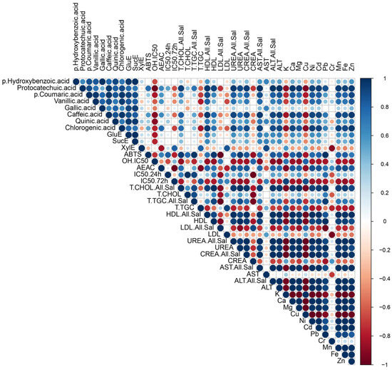 Pearson’s coefficient of the correlation matrix of the examined parameters in the ethanolic (EtOH) and hot-water (H2O) extracts of G. pfeifferi and G. resinaceum collected on the territory of the Republic of Serbia. Blue squares represent a highly significant correlation of inspected parameters, while red squares present low interactions, assessed according to the corresponding Pearson’s coefficient. The following are the abbreviations of the examined parameters: ABTS—radical scavenger capacity against 2,2′-azinobis(3-ethylbenzothiozoline)-6-sulfonic acid, ABTS•+; OH—radical scavenger capacity against hydoxyl radical, OH•; A.E.A.C.—ascorbate equivalent antioxidant capacity; IC50 24 h/72 h—antiproliferative inhibitory concentration in the case of incubation of 24 h and 72 h; GluE—glucose equivalents content of TCC; SucE—sucrose equivalents content of TCC; XylE—xylose equivalents content of TCC; All.Sal—alloxan + saline; CHOL—cholesterol; T.TGC—total triglycerides; CREA—creatinine; ALT—alanine aminotransferase and AST—aspartate aminotransferase.