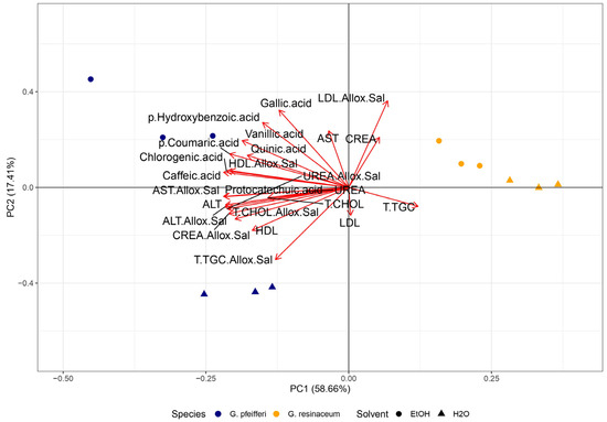 Principal Component Analysis (PCA) of the lipid-lowering properties along with phenolic compounds (Table S1) [12] and total carbohydrate content (TCC) in the four examined fungal extracts of G. pfeifferi and G. resinaceum. The following are the abbreviations of the examined parameters: EtOH—ethanolic extract; H2O—hot-water extract; Allox.Sal—alloxan + saline; CHOL—cholesterol; T.TGC—total triglycerides; CREA—creatinine; ALT—alanine aminotransferase and AST—aspartate aminotransferase; Tukey’s honestly significant difference (HSD) post hoc test (p ≤ 0.05). Data represent the mean ± standard deviation (SD).