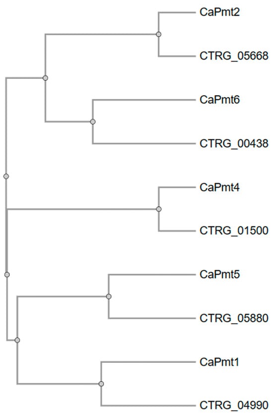 A guide tree constructed with Candida albicans PMT family members and putative orthologs on Candida tropicalis. The amino acid sequences of C. albicans PMT family members, along with the putative orthologs identified in C. tropicalis, were downloaded from (http://www.candidagenome.org/, accessed on 30 April 2024), used in multiple sequence alignments in Clustal Omega (https://www.ebi.ac.uk/jdispatcher/msa/clustalo, accessed on 30 April 2024), and from this, the guide tree was constructed. Labels starting with Ca are C. albicans sequences, whilst those beginning with CTRG are from C. tropicalis.
