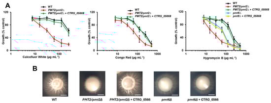 Complementation of Candida albicans PMT2/pmt2∆ heterozygous mutant with Candida tropicalis CTRG_05668. In (A), yeasts were incubated in YPD broth added with different concentrations of Congo red, calcofluor white, or hygromycin B and incubated for 24 h at 30 °C, and growth was measured by absorbance at 600 nm. Data are shown as a percentage of fungal growth in culture with no perturbing agent added. Data are means ± SD of three independent experiments performed in duplicates. The curves generated with the heterozygous mutant or the pmt6∆ null mutants were significantly different from those generated with the WT control strain or the heterozygous mutant complemented with CTRG_05668 (p < 0.05 when compared by two-way ANOVA). In (B), colony morphology after 5 days at 30 °C on Spider medium. Scale bars, 1 mm. Strains used are NGY152 (WT), HMY211 (PMT2/pmt2Δ), HMY212 (PMT2/pmt2Δ + CTRG_05668), HMY213 (pmt6Δ), and HMY214 (pmt6Δ + CTRG_05668).