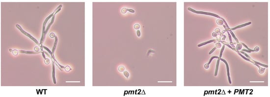 The Candida tropicalis pmt2∆ null mutant fails to undergo dimorphism. Yeast cells grown in RPMI 1640 supplemented with 2.5% (v/v) fetal calf serum for 3.5 h at 37 °C. Scale bars 10 µm. Strains used are MYA-3404 (WT), HMY218 (pmt2Δ), and HMY220 (pmt2Δ + PMT2).