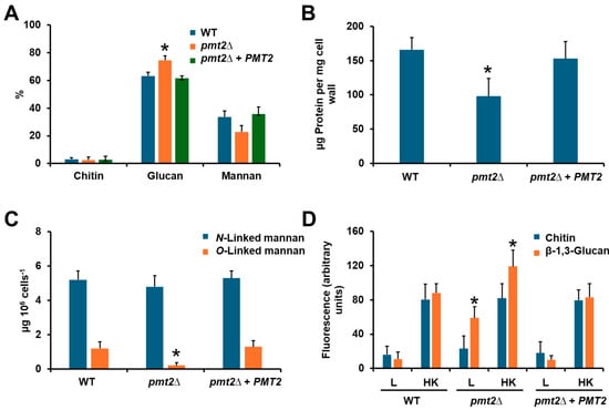 3.2. The Candida albicans pmt2∆ Null Mutant Showed Defects in Cell Wall Composition and Organization