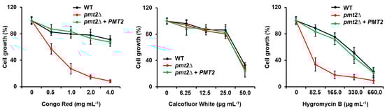 Susceptibility to Congo red, calcofluor white, and hygromycin B in the Candida tropicalis pmt2∆. Yeasts were incubated in YPD added with different concentrations of Congo red, calcofluor white, or hygromycin B; plates incubated for 24 h at 30 °C; and cell growth was measured by reading absorbance at 600 nm. Results are shown as a percentage of those obtained with control cultures were no perturbing agent was included. The same strain grown in the absence of any perturbing agent corresponds to 100%. Data are means ± SD of three independent experiments performed in duplicates. Strains used are MYA-3404 (WT), HMY218 (pmt2Δ), and HMY220 (pmt2Δ + PMT2).