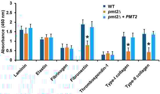 Analysis of Candida tropicalis adhesion to extracellular matrix components by ELISA. The extracellular matrix proteins were used to coat 96-well plates, yeasts were added to the plates, nonadherent cells were washed, and adhesion was detected with anti-Candida polyclonal antibodies and peroxidase-conjugated anti-rabbit IgG. Results are means ± SD of three independent experiments performed in duplicate. * p < 0.05 when compared to wild-type (WT) strain. Strains used are MYA-3404 (WT), HMY218 (pmt2Δ), and HMY220 (pmt2Δ + PMT2).