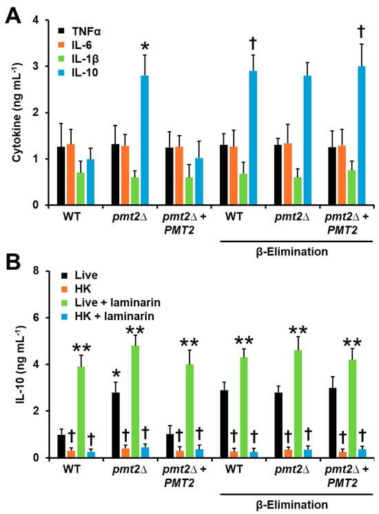 Cytokine stimulation in human peripheral blood mononuclear cells. In (A), yeast and human cells were co-incubated at 37 °C for 24 h, and the secreted cytokines were quantified by ELISA. * p < 0.05 when compared to wild-type (WT) strain. † p < 0.05 when compared to untreated cells. In (B), human cells were preincubated with 200 μg mL−1 laminarin before the interactions with yeasts. HK: heat-killed cells. * p < 0.05 when compared to WT strain. ** p < 0.05 when compared to live yeasts. † p < 0.05 when compared to untreated cells. Data are means ± SD obtained with samples from eight donors, assayed in duplicate wells. Strains used are MYA-3404 (WT), HMY218 (pmt2Δ), and HMY220 (pmt2Δ + PMT2).