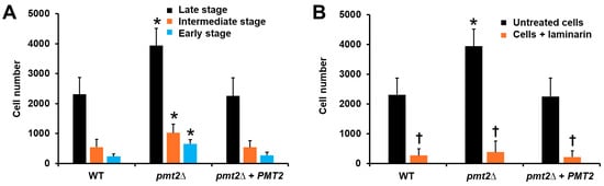 The sensitivity to some antifungal drugs was also tested but the pmt2∆ null mutant did not show significant differences when compared to the WT cells (MIC of 0.5 µg mL−1 for amphotericin B for both strains; MIC of 1.0 µg mL−1 for caspofungin for both strains; and MIC of 4.0 µg mL−1 fluconazole for both strains). Regarding biofilm formation, the pmt2∆ null mutant showed a defect in establishing a biofilm, with a reduction in the cell content and extracellular matrix components such as glucose, glucosamine, and protein, signature elements of C. tropicalis biofilms [].