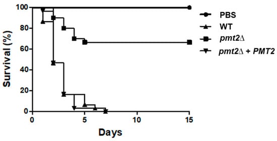 Protein-O-mannosyltransferases (Pmts) are endoplasmic reticulum (ER) membrane-bound proteins that transfer mannose residues to the lateral chain of serine/threonine residues in a co- or posttranslational mechanism []. This enzyme activity starts the O-linked mannosylation pathway, which continues in the Golgi complex, where members of the MNT gene family extend the O-linked mannan to up to seven α-1,2-mannose units [,]. In C. albicans, five Pmts have been identified: Pmt1 and Pmt5 (belonging to the Pmt1 subfamily), Pmt2 and Pmt6 (members of the Pmt2 subfamily), and Pmt4 []. Currently, null mutants for PMT genes have been generated, except PMT2, which is essential and cannot be complemented by PMT6, the other subfamily member []. The heterozygous PMT2/pmt2∆ strain was incapable of growing at 42 °C, was sensitive to high salt concentrations, and showed increased sensitivity to cell wall-perturbing agents and antifungal drugs []. Thus, it has been proposed that Pmt2, along with Pmt1 and Pmt4 are responsible for most of the Pmt activity, and Pmt5 and Pmt6 have a regulatory activity, in particular of the targeted protein for O-linked mannosylation []. Similar to Saccharomyces cerevisiae, it has been proposed that Pmt1 and Pmt2 form a functional heterodimer to catalyze the transference of the monosaccharide to proteins [].