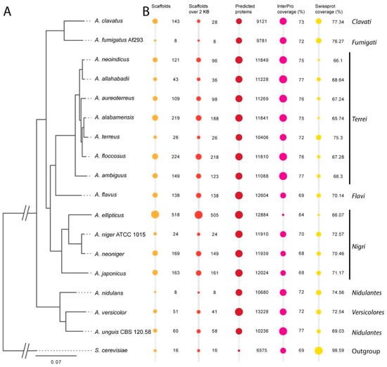 Figure 1. Dendrogram and bubble plots illustrating phylogenetic distances among seven genomes from section Terrei. Ten other Aspergilli representing different sections are added to place the Terrei in the genus-wide phylogeny. S. cerevisiae is added as an outgroup. Additional information is available in Table S1. (A)—Phylogenetic tree created using RAxML [49], MAFFT [50], and Gblocks [51] based on 200 conserved genes found in one copy in each of the genomes (monocore genes). (B)—Bubble plots of key genome statistics. The bubble sizes are scaled within the categories and are not comparable across categories.