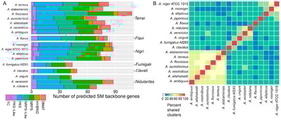 Analyses of secondary metabolism of A. terreus already showed a high diversity in the products formed. Therefore, we were interested in mapping genes responsible for the diversity of secondary metabolism in section Terrei relative to A. terreus and other sections of Aspergilli. Secondary metabolite gene clusters (SMGCs) were predicted based on a SMURF-like prediction method [38]. In total, we predicted 3275 genes in the six new genomes potentially involved in secondary metabolism (Table S2). So-called backbone genes, including synthases, synthetases, and cyclases, that are involved in producing the backbone compound to be modified by other cluster encoded enzymes were counted and sorted into categories based on predicted functions (Figure 2A). In total, we found 495 backbone genes in the new genomes, which indicates that the species of section Terrei are similarly rich in secondary metabolism as the secondary metabolism-rich section Nigri (Figure 2A). In particular, A. floccosus revealed 108 backbone genes across 88 predicted clusters. As far as we are aware, this is the highest number of genes found for secondary metabolite production in a single Aspergillus species. Intriguingly, this enriched number comes from an expansion of nearly all classes of secondary metabolite backbones, whereby the genome itself is not particularly expanded as seems to be the case for genomes of species from section Nigri. Since A. floccosus has not been reported to produce a large number of known secondary metabolites [26], our analyses suggest that several of these genes and gene clusters may be responsible for the production of new compounds.