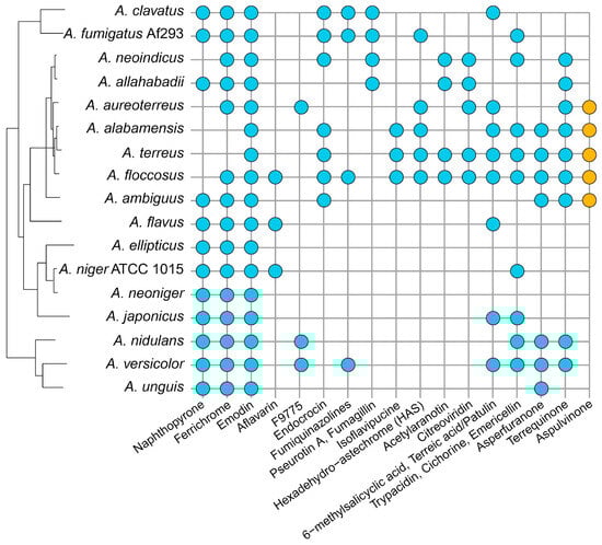 Figure 3. Association of gene clusters from section Terrei to previously assigned and characterized orthologous gene clusters. All gene families were compared to the MIBiG database to identify clusters homologous to characterized gene clusters. Gene cluster families with an associated characterized cluster are marked with a dot for all species containing a member of the gene cluster family, and, thus, presumably also a proposed compound. The family associated with Asp-melanin production from aspulvinone E (orange) was added manually through searching for the A. terreus aspulvinone E synthetase MelA. The secondary metabolites mentioned in Figure 3 are not necessarily exactly the same; for example, aflavarins are produced by species section Flavi (in the sclerotia), while species in section Nigri produce the very similar kotanins in the mycelium (but the gene clusters for those polyketides are quite similar).