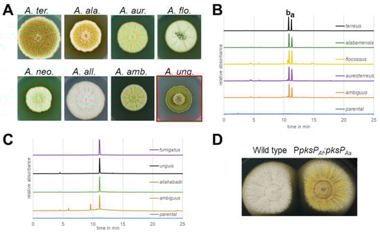 Figure 4. Analysis of conidia pigmentation in section Terrei. (A) Phenotype of colonies of species from section Terrei and of A. unguis from section Nidulantes on complete Aspergillus medium. A. ter. = A. terreus, A. ala. = A. alabamensis, A. aur. = A. aureoterreus, A. flo. = A. floccosus, A. neo. = A. neoindicus, A. all. = A. allahabadii, A. amb. = A. ambiguus, A. ung. = A. unguis. (B) HPLC analysis of products formed from the heterologous expression of melA homologues from section Terrei in the A. niger expression platform ATNT16 (parental). a—aspulvinone E, b—isoaspulvinone E. (C) HPLC analysis of products formed from the heterologous expression of pksP homologues from section Terrei and from A. unguis and A. fumigatus in A. niger ATNT16 (parental). (D) A. allahabadii wild type and transformant with a fusion of the A. fumigatus pksP promoter with the A. allahabadii pksP gene (PpksPAf:pksPAa).