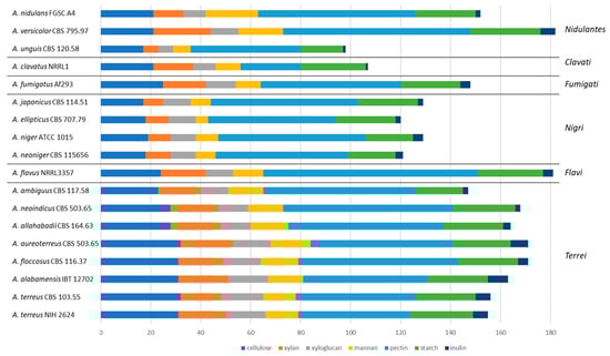 Figure 5. Comparison of plant polysaccharide degrading potential of section Terrei and reference species. The x-axis presents the number of genes in polysaccharide-specific CAZy families. The horizontal lines separate the sections within the genus Aspergillus.