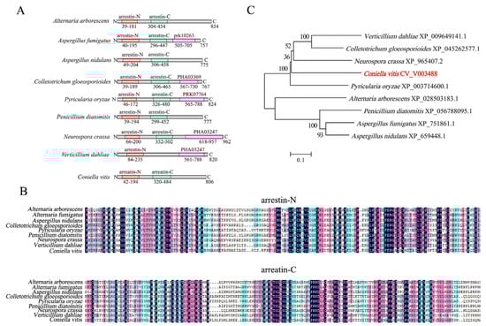 Yin, X.; Chen, Z.; Li, T.; Liu, Q.; Jiang, X.; Han, X.; Wang, C.; Wei, Y.; Yuan, L. The Arrestin-like Protein palF Contributes to Growth, Sporulation, Spore Germination, Osmolarity, and Pathogenicity of Coniella vitis. J. Fungi 2024, 10, 508. https://doi.org/10.3390/jof10070508