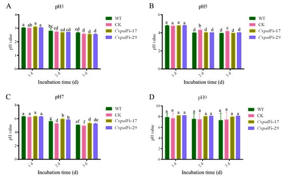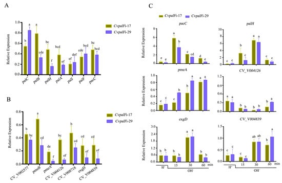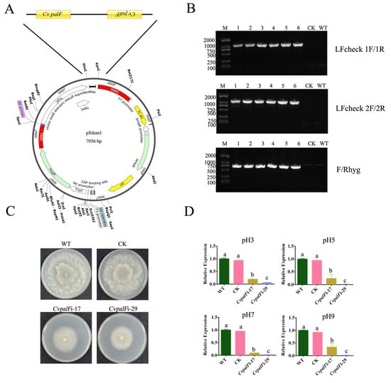 3.3.1. The Growth of CvpalF-Silenced Strains Under Different pH Values