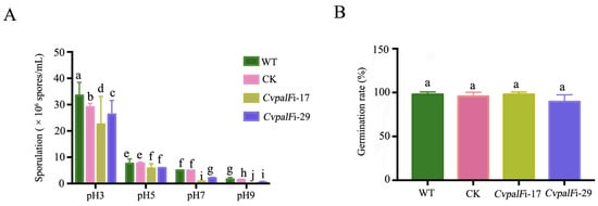 3.3.3. Sporulation and Spore Germination of CvpalF-Silenced Strains under Different pH Values