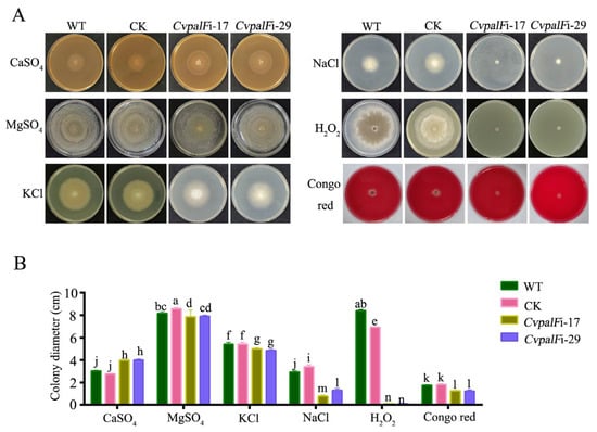 3.3.5. The Responses of CvpalF-Silenced Strains to Cell Wall Integrity, Oxidation, and Ionic Stress